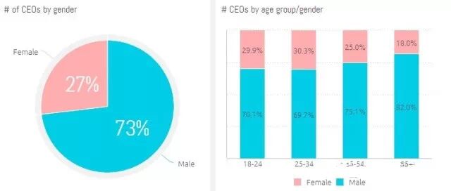 最年轻的年龄组中,女性CEO的比例略有下降,一个可能的解释是因为男性更可能加入创业的行列。他们当中11.3%的人在自己的技能组合中,列出了’创业’一项,而只有7.9 %的女性列出了这个技能。众所周知,创业公司比其他任何行业拥有更年轻,更具创新力的领导者。