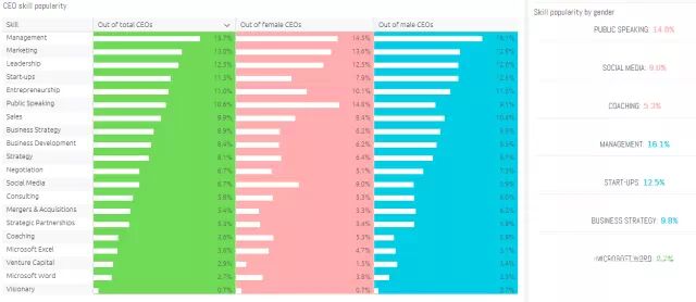 这组数据同样也向我们提出了这样的一个问题,是否有些技能比其他技能更加的男性化或是女性化,或是说使用起来更青睐某种性别的人士。举例来说,技能“谈判交涉”与“商业策略”在男性中出现的更多,而“社交媒体”,“指导”和“公众演讲”则被女性更多的列出。这进而让我们思考:女性是否在展现友善的公众形象方面承受更多的压力?