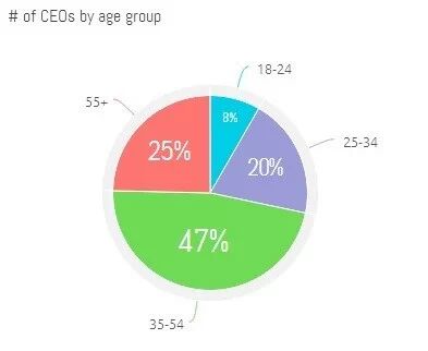 一个哲学争论是无法给出明确答案的,这也就是为什么数据分析是给出一个客观解释的最佳方式。我们将得到的数据可视化,发现大多数CEO年龄都偏大:几乎半数的CEO的年龄在35-54岁之间,而55岁以上的CEO占到了总人数的四分之一。虽然有五分之一的CEO年龄是在25到35岁之间,但是进入公司管理层的最佳年龄是在35岁或以上。