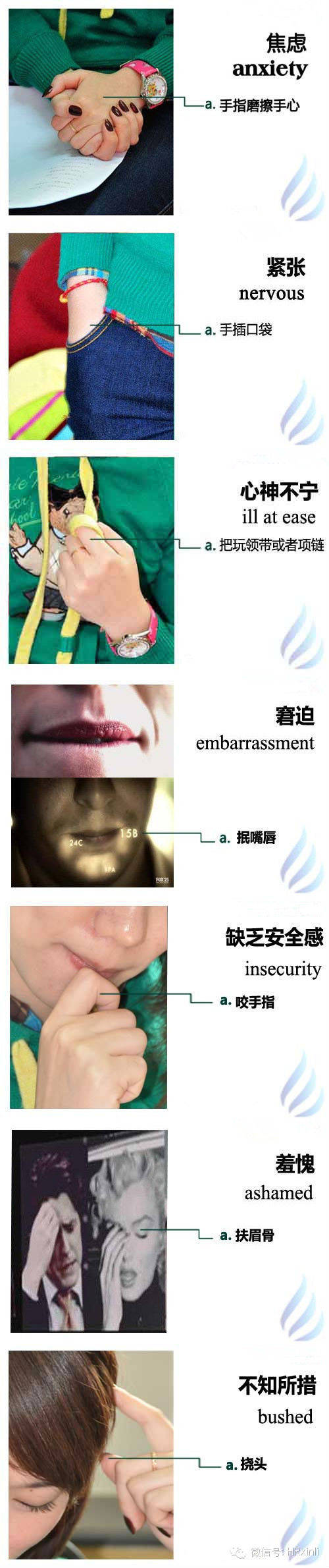 20、手一直摩挲,一种自我安慰的姿态,当你不相信自己的在说什么的时候,使自己安心说谎的时候会摸脖子,这是个经典的动作。